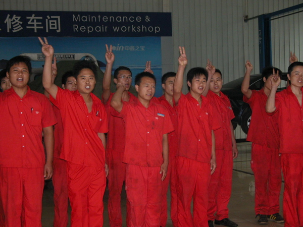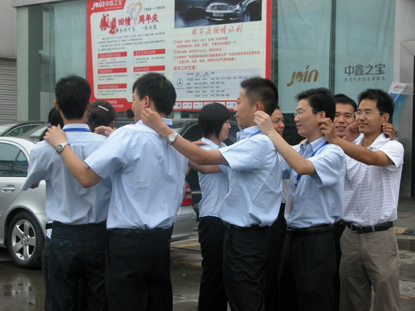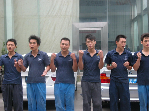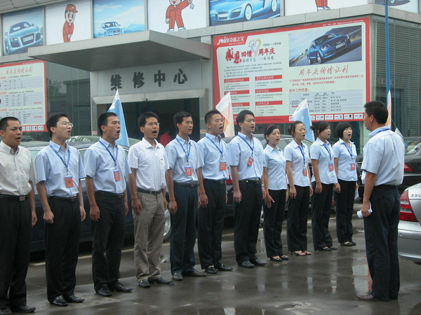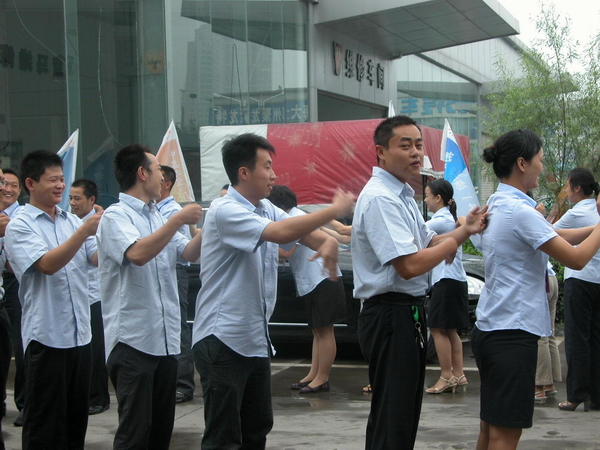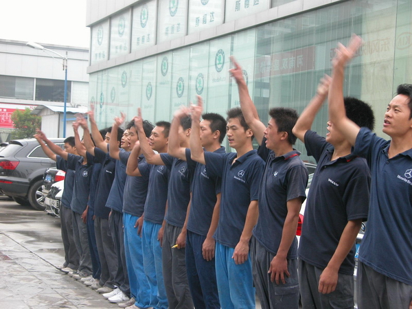 (五)、奔驰车间大声喊出了公司晨会问好仪式,“好,很好,非常好,我们神采飞扬,耶,耶,耶!”