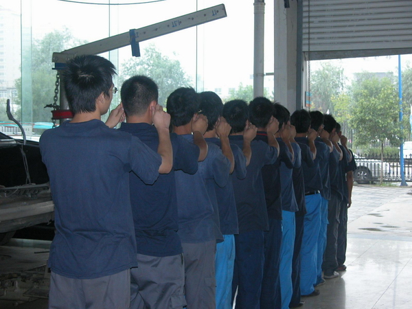 (七)、钣金车间排成一条龙正在做按摩操,整齐划一,很有节奏感!