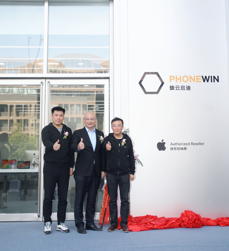Apple中国区企业客户部总监李晓萌先生、河南省国家大学科技园(东区)总经理洛明先生、郑州天之创供应链管理有限公司总经理刘善忠先生、蜂云启迪科技有限公司总经理单晓先生和蜂云启迪科技有限公司董事陈剑先生共同出席了开业仪式,并为新店开业进行剪彩。