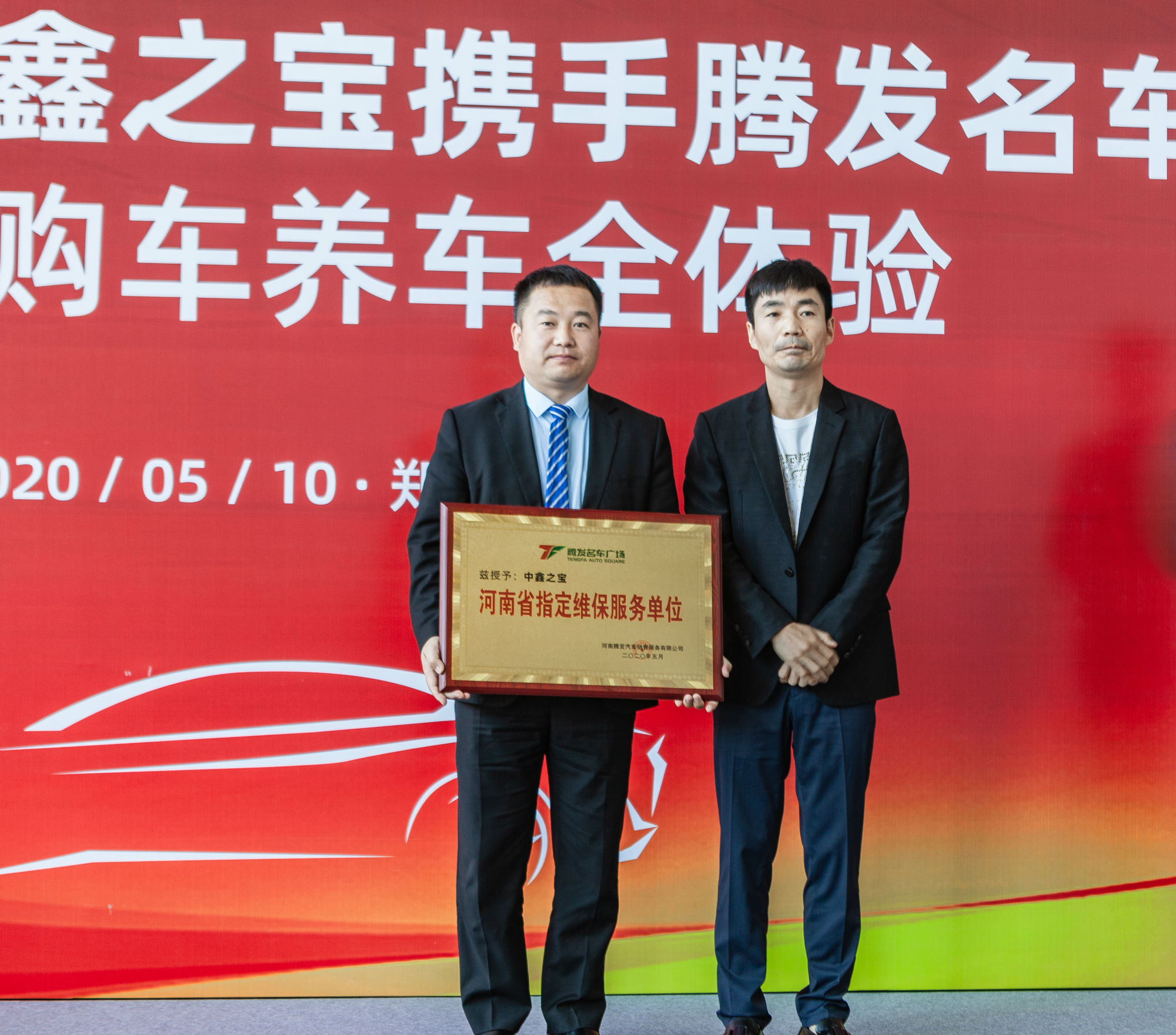 倡导汽车精修深养的中鑫之宝携手深耕二手车行业20年的腾发名车,共同为客户打造购车养车全体验。双方将以此为起点,共启合作之路,中鑫之宝成为腾发名车“河南省指定维保服务单位”,腾发名车向中鑫之宝授牌。