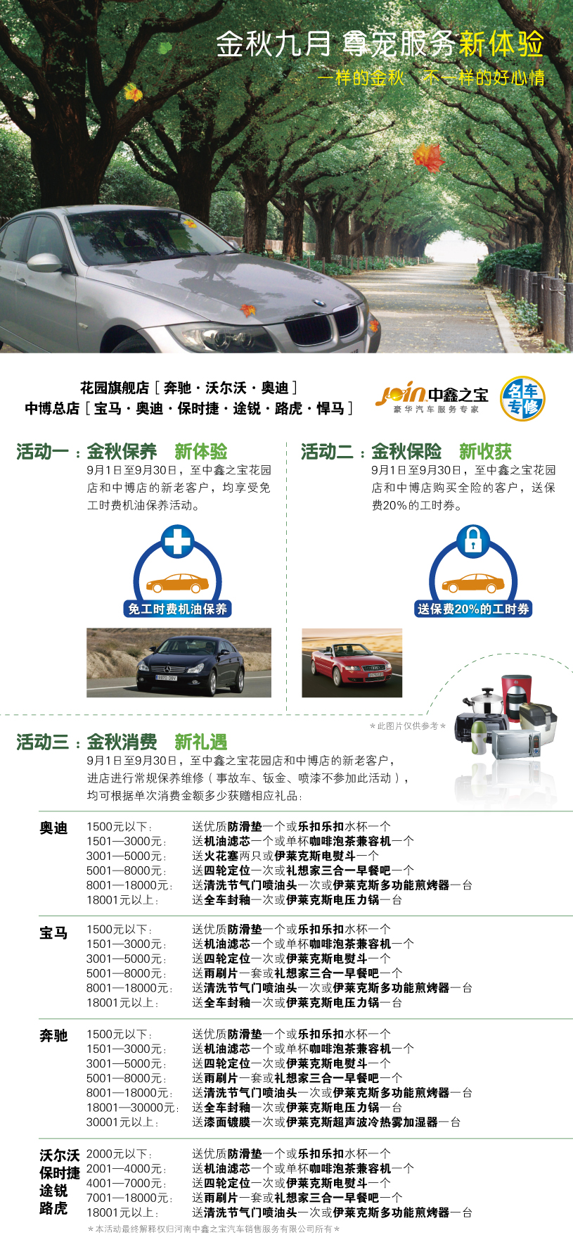 9月1日至9月30日,,至中鑫之宝花园店和中博店购买全险的客户,送保费20%的工时券。