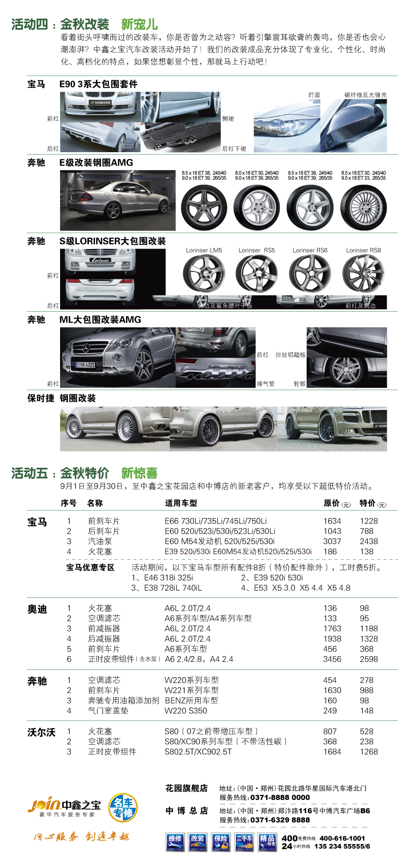 9月1日至9月30日,至中鑫之宝花园店和中博店的新老客户,进店进行常规保养维修(事故车、钣金、喷漆不参加此活动),均可根据单次消费金额多少获赠相应礼品: