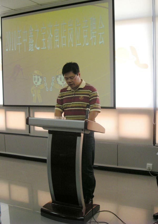 继福建泉州店之后,河南中鑫之宝汽车销售服务有限公司省外第二家分店山东济南店即将开业,济南店的团队筹备工作也拉开了序幕。2010济南店岗位竞聘会于5月30日在花园店召开,这标志着中鑫之宝济南店的人员岗位组建正式步入实质性阶段。