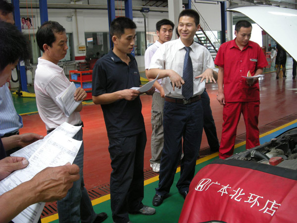6月18日至6月21日,中鑫之宝花园店与中博店的部分车间、客服人员到兄弟公司广州本田北环店进行参观学习。广本店相关人员先带领大家参观了整个店面,之后到车间与客服中心观摩技术操作流程及标准服务流程,最后由车间及客服人员给大家深入讲解了5S管理与服务流程,并进行了热烈的现场讨论。