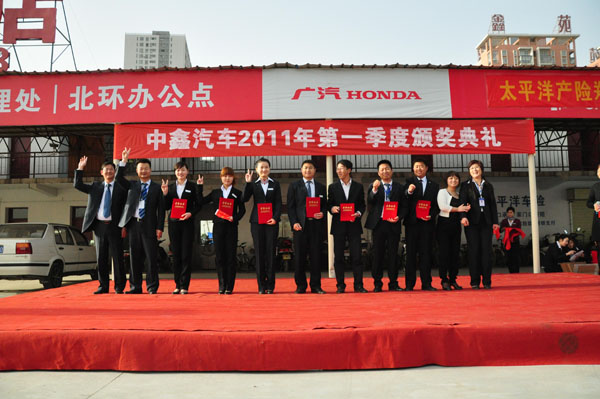 4月18日上午7点30分,中鑫集团旗下中鑫汽车版块在北环广本店隆重召开2011年首季开门红总结表彰大会,认真总结一季度生产经营工作,全面部署下一阶段的重点工作,隆重表彰一季度优秀团队、优秀个人和奖励鑫光团队纪念奖币。中鑫集团总负责汽车业务高级副总裁田玉峰先生出席会议并作重要讲话。会议由中鑫之宝人力行政总监助理张志强主持。中鑫汽车版块领导卢玉萍、杨永刚、王波、陈金舟等人出席会议。中鑫之宝花园店、中博店和广汽本田北环店的所有员工参加了本次表彰会议。