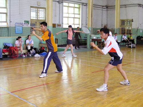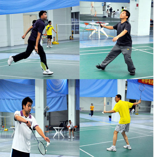 随着选手的陆续到来,在签到、分组后,比赛正式拉开序幕。首先进行的是单打比赛,一对一的较量中,比赛选手充分发挥自己的优势,高远球、反手发网前球,虽技术上不是专业球员,认真的劲头上却丝毫不含糊。双打比赛中,配合默契,丝毫看不出是首次组合。大家挥动着手中的球拍,步伐随着羽毛球的位置而移动着,更有人奋力跳起,球拍在空中划出美丽的弧线,整个场地中不时地传来清脆的击球声。看台上,比赛顺序靠后的选手主动为正在比赛的选手进行计分和仲裁。