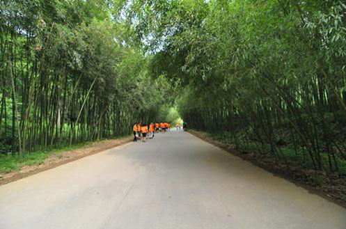 景区内竹林遍布,犹如世外桃源一般,不由得让大家想起《卧虎藏龙》里竹林打斗的场面。伙伴们首先来到了农耕村,扑面而来的是绿色的长廊,爬满青藤的土墙茅屋,穿着土布的山民,各种手工作坊、民间艺术表演场;扑鼻而来的是酒香油香去欣赏滴翠河景区,大家一路说笑、欣赏美景,合影留念。11点,大家到达农耕村集合点,经过30分钟的休整、简短午餐后。森林穿越活动即将开始。