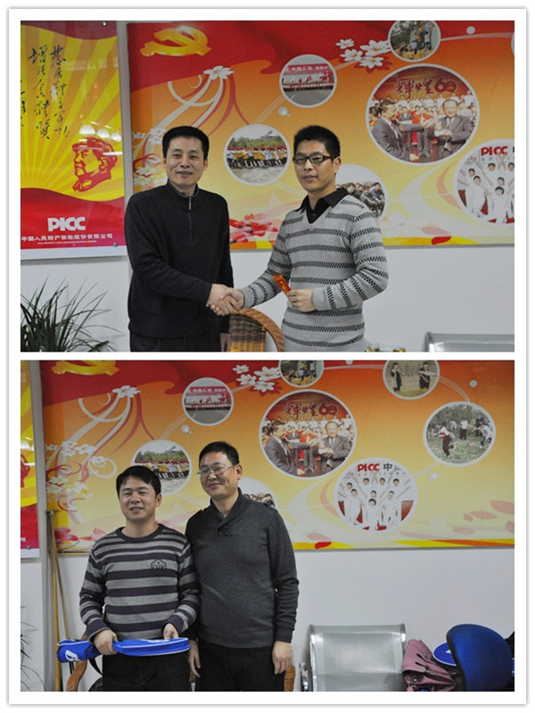 比赛在和谐的欢呼声中圆满结束。杨总、李总及人保财险郑州市分公司副总兼理赔部主任牛春林为获奖选手颁发了奖品并合影留念。本次比赛不仅为我公司提供了一个对外交流、切磋球技的平台,还展示了我公司员工饱满的精神风貌和团队作战的协作精神,为我公司企业文化的进一步的推广注入了新的活力。