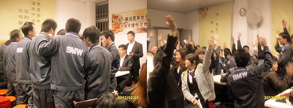 时间一分一秒的过去,会场的气氛越来越紧张,只听见到处都是不同的想法,大家绞尽脑汁,畅所欲言,俗话说得好,“三个臭皮匠,顶过一个诸葛亮”,通过每个团队成员的合作,很快有的队就有了自己“队名、队呼、队歌”。只听到扳喷车间在角落里开始了自己队名队呼队歌试音,更是激发了其他团队,在这个狭小食堂里,此起彼伏的队歌不断响起,气氛异常火爆,第一个上交的是“兄弟联队”钣喷车间,第二个是“捷奥队”奥迪车间,第三个是“鑫锋队”市场部……各自都用精辟简介的语言将本部门工作、精神、目标凝聚在“队名、队呼、队歌”中,慷慨且激昂。
