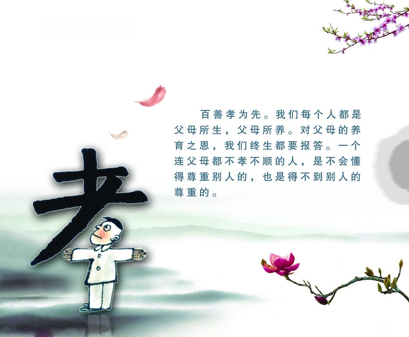 “孝”的基本含义是善事父母,古语有云:百善孝为先,孝道是中华民族的基本传统道德行为准则。但是,“孝”不能够狭义的理解为在父母身边晨昏定省,“夫孝,始于事亲,中于事君,终于立身”(《孝经.开宗明义章》)。立身然后方可言孝,而“立身”不外乎“立德、立言、立功”,这三者之间虽有区别,但总体上来看,“孝”不局限于家庭内侍候父母的范围,而是一种社会的事业,这才是广义的孝。对我们而言,通过自己的努力,获得家庭生活保障、社会地位与家族荣誉,也是“孝”。