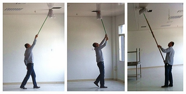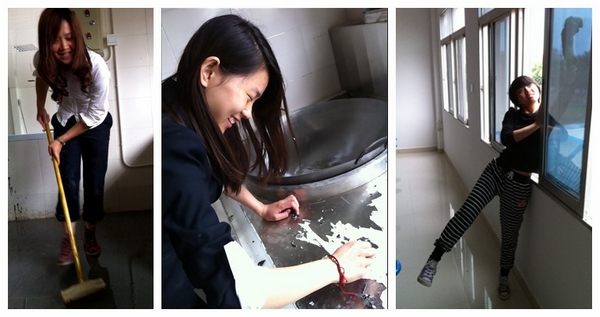福州店食堂大扫除进行中,周总身先士卒,手握新拖把,横扫天花板。