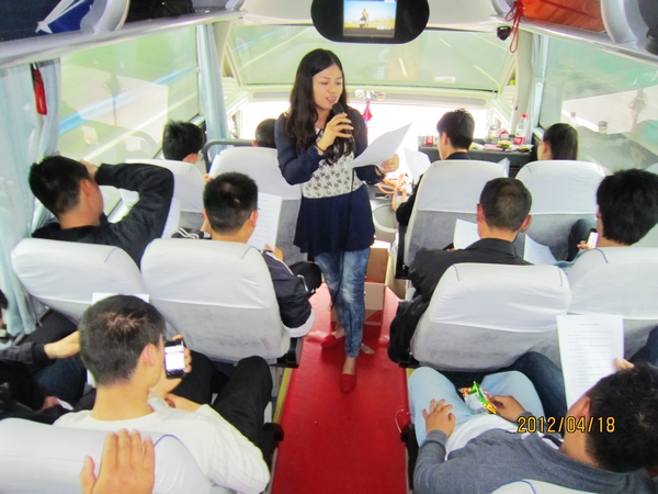 俗话说“旅途长漫漫”,但我们这次长达4个小时的旅途却是“说话间就已过去”,旅游车刚出发没多久,我们的导游、可爱的飞飞女士首先为大家献上一曲,车间的帅哥自然是不敢甘示弱,一曲接着一曲,那歌声既铿锵有力又婉转动听;还有大家公认的情歌王子“小宝”,更是才华尽显,车厢内的气氛很是活跃,掌声是此起彼伏,连绵不断。人们常说:“机会都是给有准备的人预留的”,平时大家都是埋头干活,没有闲话,关键时刻都是一鸣惊人,真可谓是深藏不漏!不但美女如云,帅哥也是一撒一箩筐;在工作中个个都可谓是技术高手、专业人才,生活中艺术家、歌唱家比比皆是。