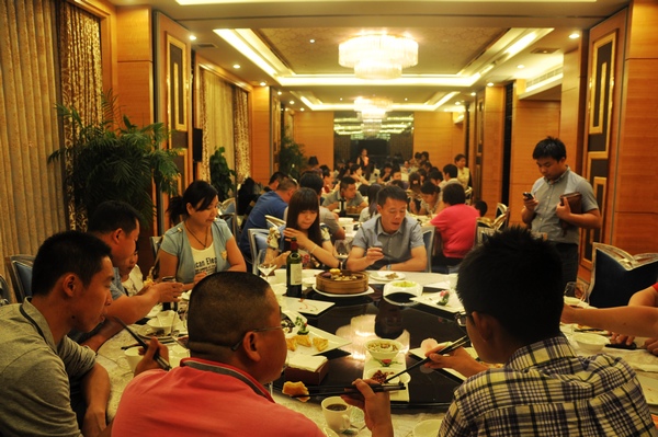 经过20分钟行驶,顺利地抵达中午用餐处“玉京酒店”。庞大的车队,瞬时间覆盖了整片停车场,车友们争先恐后地下车,欣赏着玉京酒店四周美丽景色。十一点四十分,车友们入座提前安排好的4个大包间,开始享用具有当地特色玉京富贵鸡、椒盐蚕蛹、八宝荔浦芋、玉京包子、杂粮炕饼等美味。