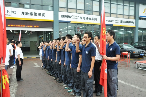 花园店奔驰服务中心、宝马服务中心、奥迪服务中心、钣喷中心、营销中心、行政中心六支队伍分别嘹亮的口号声中,以军人庄严的神态矫健的身姿“集体作业”。为快速提升团队的凝聚力和执行力,提高企业的工作效率,提升企业的形象员工的精、气、神及团队气势,8月23日,公司下发了《晨会调整通知》,中博、花园两店上到副总经理下至基层员工,开始了军事化晨会训练。