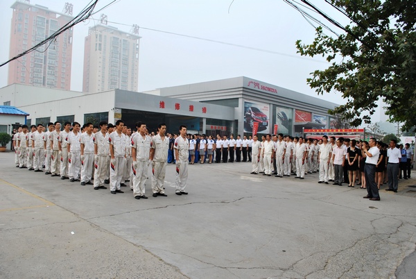 今天的北环店却与往常不同,一列列整齐的队伍在门前集合,令行禁止,整齐划一,口号声此起彼伏。销售团队、售后前台团队、机修车间、钣喷车间、精品美容车间……一支支队伍站如松动如风,阵容齐整、士气凌人!一时间,向来宁静的晨旭路变得躁动起来,行人纷纷驻足观看,若不是服装不同,还以为错进了军营。说话间已经有路人开始交头接耳:“没见过这样的4S店,买个车还整得跟打仗一样,这阵仗也太唬人了吧?”