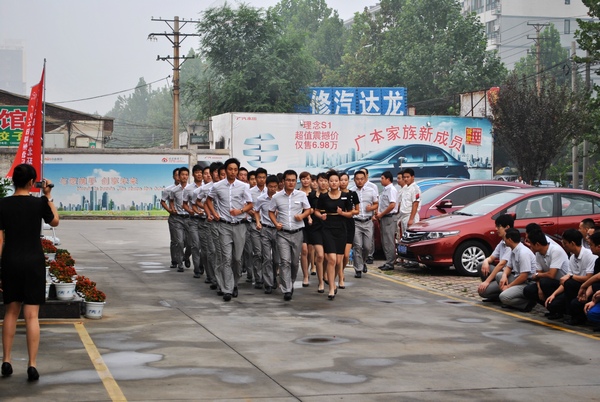 秦总(广本北环店销售副总):北环店需要的不仅仅是一两个优秀的销售精英,更需要一支团结协作、共同奋斗的销售团队。通过军训,我希望锻炼出一支知荣辱、敢担当、进退有据、不离不弃的销售团队。我也希望我们整齐划一、号令鲜明北环形象能带给客户耳目一新的感觉,向客户传达我们北环店的信心。