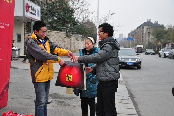 由于天气太冷,很多义工的双手也已经被冻得通红……为了能稍微暖和些,大家一起不停地跺脚、搓手,“不如我们跳舞吧”,这个决定得到了大家的响应。现场的欢乐气氛引起小小的骚动,很多捐赠者表示:是我们的义工让自己心生温暖。