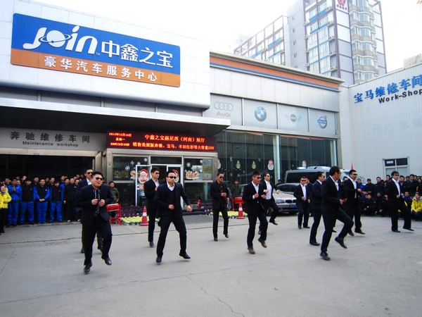 “独乐乐不如众乐乐”,在各个团队的创新下,《江南STYLE》已经注入中鑫特色的血液。本周中博店的晨会异常欢乐,事故车开发部的同事眼戴墨镜,身着黑色西装,俨然是正牌“鸟叔”登场。不仅如此,《航母STYLE》也集体亮相。真如老田在微博上那句:“屌丝青年欢乐多!”