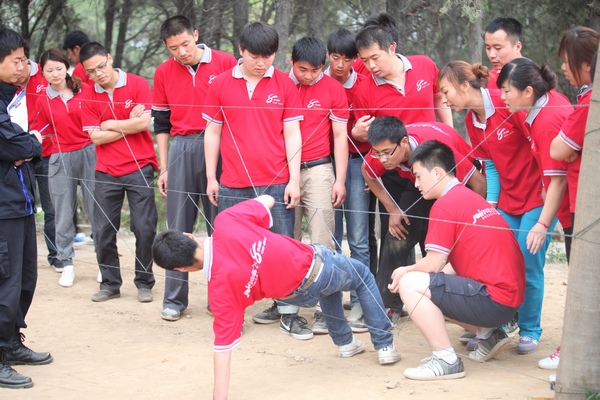“穿越电网”充分体现了整个队团结协作能力,刚开始穿越电网时屡屡触电,只好重新再来,大家冷静下来,进行了明确分工,有人指挥,有人帮助,有人监护,采取“抱、抬、托、举”等手段都用上了,大家紧密配合,顺利钻过了“电网”。