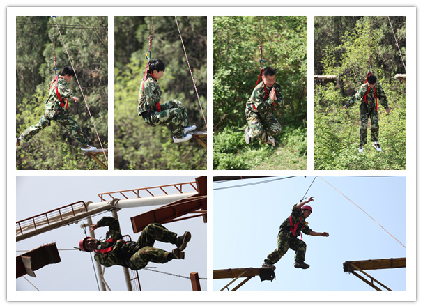 随后的各种户外高空作业训练过程中大家经历了恐惧、痛苦和伤痛,但是更多的是感动、感谢和自信,是来自团队的鼓励和团队的力量使大家战胜了各种困难,勇于挑战自我;“高空断桥”是一个挑战自我,感受团队的项目。队员站在8米高的一个断桥上,跃过1米的断桥口,再一跃而下。需要参与该项目的各队队员调整好自身心态,克服个人的恐惧感,勇敢的挑战自我,但更离开团队的鼓励!