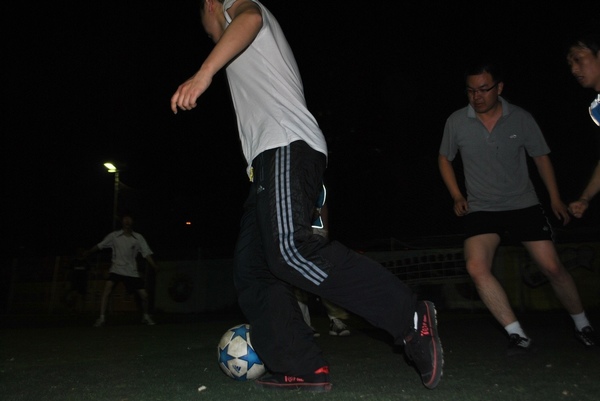 翻越两重围栏捡回球后,比赛正式开始。因为双方都是人多势众,所以一开始比赛就进入白热化,你来我往,拼抢十分激烈。三分钟后,素有“黄金右脚”之称的李凡大叔瞅准空挡,边路带球勇猛突进,突然夜色幢幢中几条黑影窜出!说时迟那时快,李凡大叔倒地一个护球,巧妙地把球停在脚下。几名防守队员猝不及防,纷纷跌作一团,皮球在七八条腿中不断变化方向,最终在多个方向力量的推动下,划出一条诡异曲线飞入网中,球进啦!!虽然不知功臣是谁,但进攻方得一分!