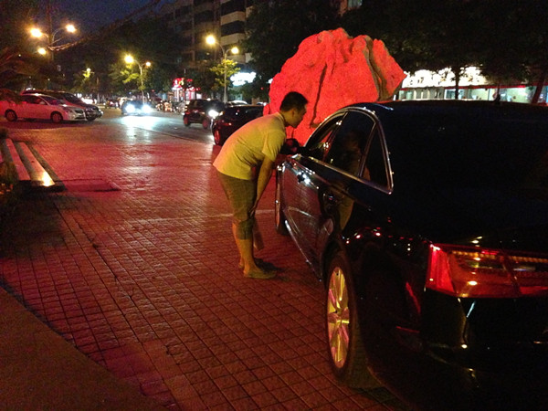 七月末的几天,人在屋里呆着,汗如瀑布往下流,户外更是高达40°的高温。闫晓韶骑着滚烫的电动车带着我,去停车场查看一辆奔驰的事故车。前天,停车场老板养的一条松狮被热死了,果真是苦夏。车子暴晒在太阳下,看门的大叔也不怎么愿意完全踏出有空调的门卫室,半踏着门接过闫晓韶递过去的烟,寒暄着聊车子处理进度,而后转往新玛特商场扫街,闫晓韶白色的Polo衫前后被汗水浸透,脸上被晒的黑里发红,为了不耽搁他扫街,我们分开两路,他绕停车场转了两圈,扫到两辆车的信息,天气太热,车少,遇到车主也不愿开窗户,扫街比平常难度大很多。