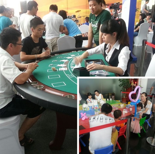最后重头戏是娱乐项目百家乐筹码游戏,由现场工作人员分发给参与客户一定筹码,工作人员做庄,客户与客户之间互相展示牌技,最后赢得的筹码可以用来换取相应的礼品,中鑫之宝拉斯维加斯现场可说是热情高涨,无限火爆。此外,在活动现场还独立设置了儿童娱乐区,儿童娱乐区内一片欢声笑语,DIY陶瓷制作工艺不仅让家长觉得欢喜,也让所有小朋友尽兴的玩耍。整个庆典活动现场气氛和谐,欢乐不断。客户和中鑫汽车人在这里,在此刻,成为了一家人。