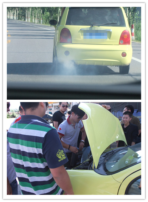 在我们车队中有一辆小QQ,整个路程中车队里的其他车都照顾着QQ的速度,实时的关心着它的位置。QQ在归途上有点小故障,排气管冒着蓝烟,当到达服务区时我们停下来对它做了全面的检查,原来是烧机油了,好在来前有准备,及时的加上机油暂时解决了故障继续上路。