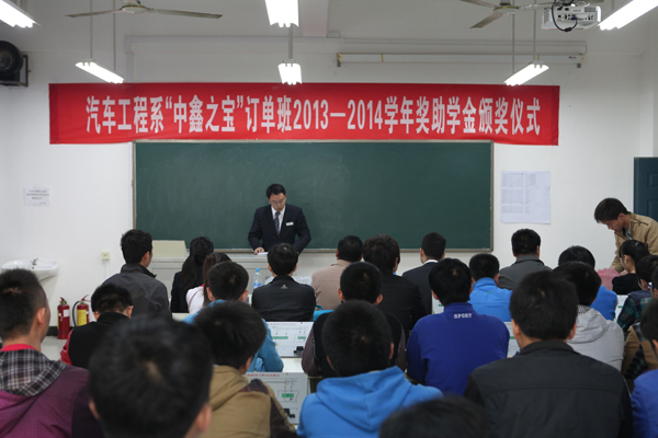 颁奖结束后杨总发表讲话,在讲话中杨总为学员们分析了目前汽车行业就业形势,同时介绍了中鑫之宝的发展状况以及未来发展规划,杨总指出,在中鑫之宝的未来五年计划中,中鑫之宝店面将增加到200家,汽车人才是必不可缺的,要求同学们在学校的时间里,努力学习基础知识,在将来的发展中在才能立于不败之地,同时也希望大家在就业之际选择中鑫之宝,中鑫之宝的大门永远为学员班的汽车人才敞开!接着汽车工程系胡主任对中鑫之宝此次的颁奖表示了感谢,胡主任也希望学员们把握现在良好的学习环境,努力学习,争取成为中鑫之宝未来发展中的顶尖人才!