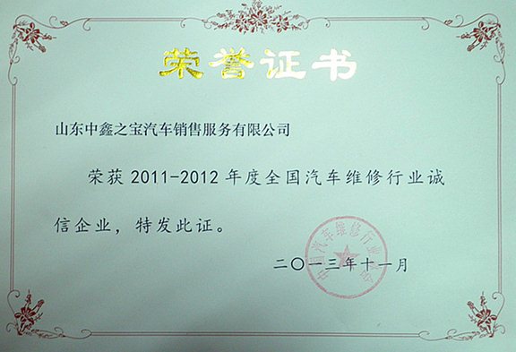 接中汽修协字(2013)31号文件通知,为进一步推动《全国汽车维修行业行为规范公约》的贯彻实施,促进汽车维修行业诚信机制的建设,倡导诚实守信的经营理念,营造公平竞争的市场环境,中国汽车维修行业协会发出号召,在全行业深入开展创建汽车维修行业诚信企业活动。经过评估、推荐、公示等环节,山东中鑫之宝汽车销售服务有限公司在各管理层带领下,全员积极参与,凭借着公司的良好声誉终荣获了2011—2012年度全国汽车维修行业诚信企业。(注:“全国汽车维修行业诚信企业表彰”是经国务院同意,交通运输部评比达标表彰的8个项目之一,周期2年,由中国汽车维修行业协会主办。)