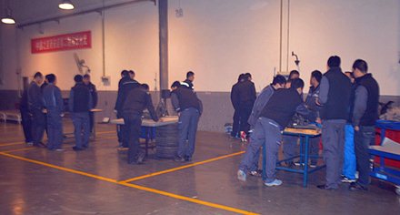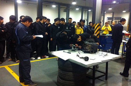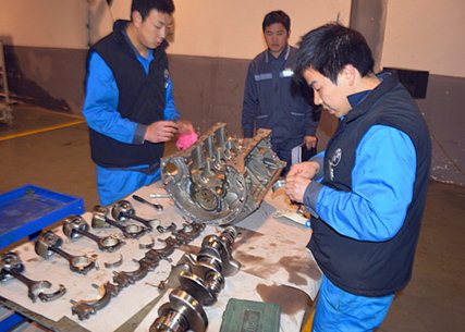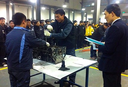 首先由裁判宣读比赛规则,比赛项目是:发动机的拆装、量具的测量使用到最终维修方案的提交。参赛选手为每个车间三人,可配备一名助手。在规定的时间内完成发动机的分解组装和测量,最终每组比赛人员提交各自的维修方案。西安店总经理白总动员讲话一结束,各位参赛人员便摩拳擦掌跃跃欲试,都想立刻投入到比赛当中,比赛随着裁判员一声令下便开始了。