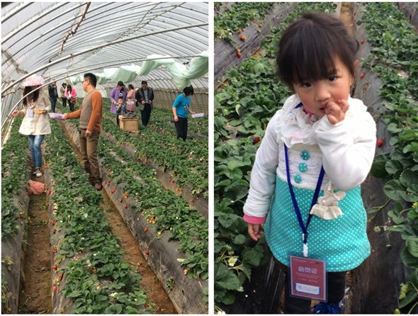 不一会,我们就离开了喧嚣的城市,向着草莓园疾行。清新的空气里夹杂着草莓的香甜味顿时让客户们感受到了置身于大自然中的清爽,大家小心的将一颗颗草莓收入篮中。午餐时间到了!为了进一步感受到当地民风,体验农家生活,我们还为客户准备了地道的农家特色菜肴。