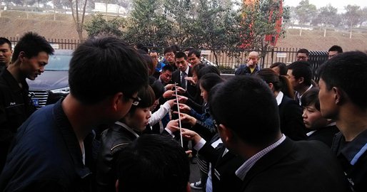 第二个比赛项目:齐眉杆;这是一个挑战团队精神的项目,每个人的表现都会影响团队的成绩。一根小小的杆要分布在10个人的手指上,缓慢的移动,不能离开任何一人的手指,看似简单的项目却只有1个队伍挑战胜利,这个比赛项目让团队的每一位成员都能了解到,团队的成长是个人成长的基石。