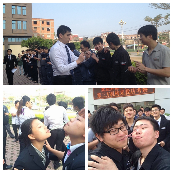 2014年4月10日早上7:30,中鑫之宝晋江店全体员工开展了团队游戏之“钥匙传递”。每个团队要凝聚队员的力量以最快的速度传递到最后一个人的吸管上。首先是主持人讲完游戏规则后,第三组的队员上台为大家做了示范。