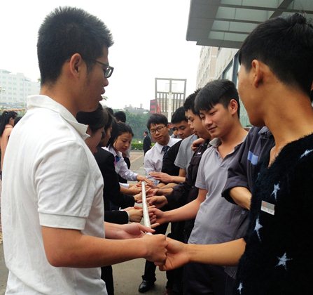 游戏开始前,先是让所有队伍练习5分钟,这个看似简单的游戏,真正做起来,大家才体会到其中的困难。游戏中,有的队伍棍子斜了,有的队伍中一部分人的手离开了棍子,有的队伍移动太快了……通过一次次地练习,最终7支队伍中只有4支队伍挑战成功。