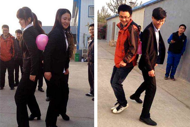 继欢乐的跳大绳之后,11月17日,新乡店举办了第二个比赛项目——双人背气球比赛,在几轮淘汰之后,剩下了三组精英人员,但无缘参加比赛的同事也没放弃,而是组成啦啦队为本队队员助威呐喊,其中车间与配件为一组,财务与市场部为一组,事故车、前台SA、电话营销部、客服部、行政人事部为一组。裁判一声令下后,第一队队员背对背夹好气球开始跑步,不少队员在跑步途中气球掉在了地上,但他们仍然不放弃,而是迅速跑回原点,重新开始,比赛气氛逐渐变得热烈。最后事故车、前台SA.电话营销部、客服部、行政人事部等部门组成的综合队赢得了冠军。