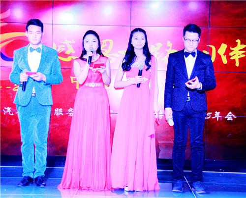 接着,在激昂的音乐中,四位神秘主持人亮相,宣布中博店2015年迎新春年会正式开始。